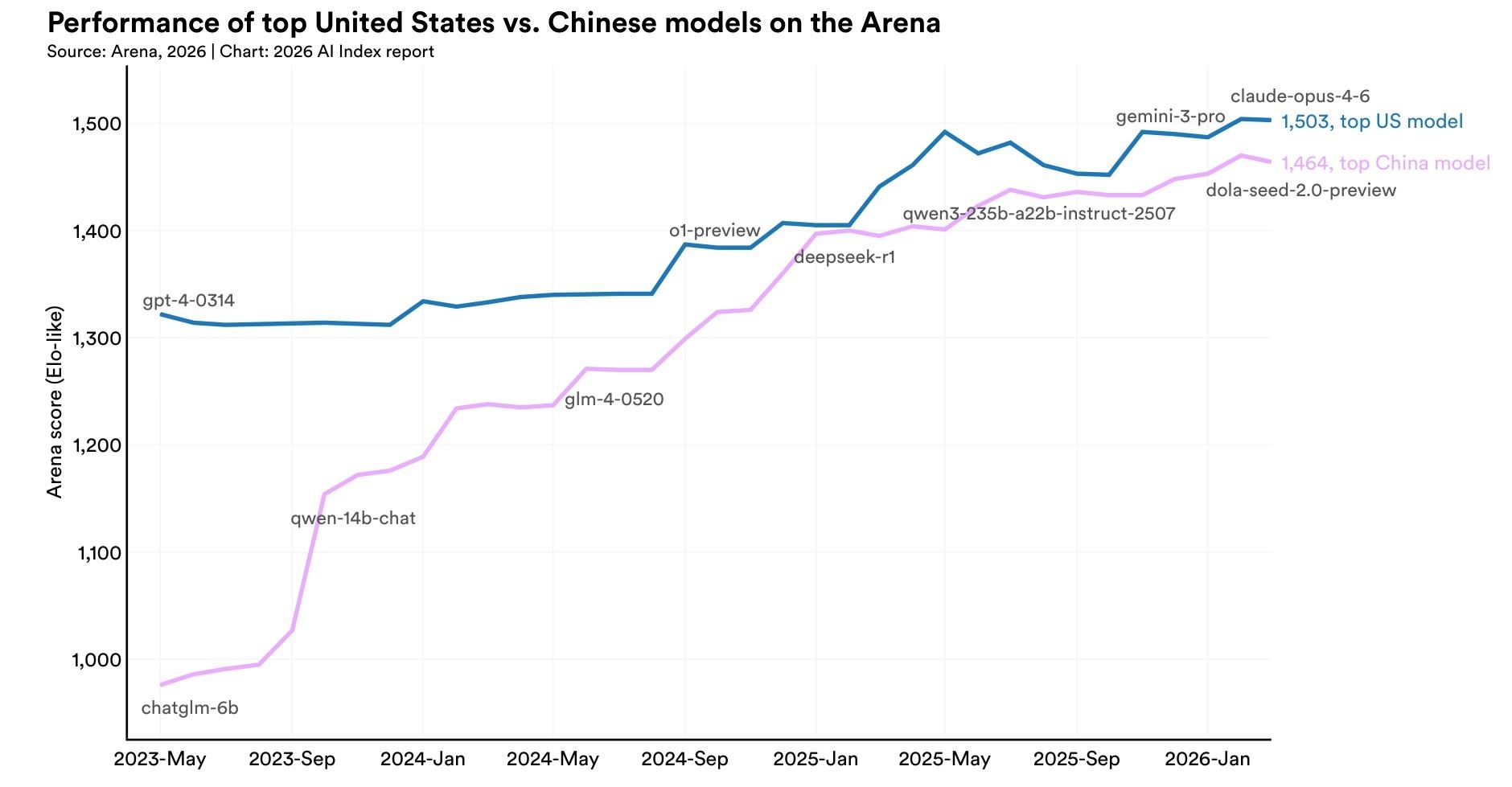 The US-China AI performance gap has effectively closed, with Anthropic's top model leading China's best by just 2.7% as of March 2026.