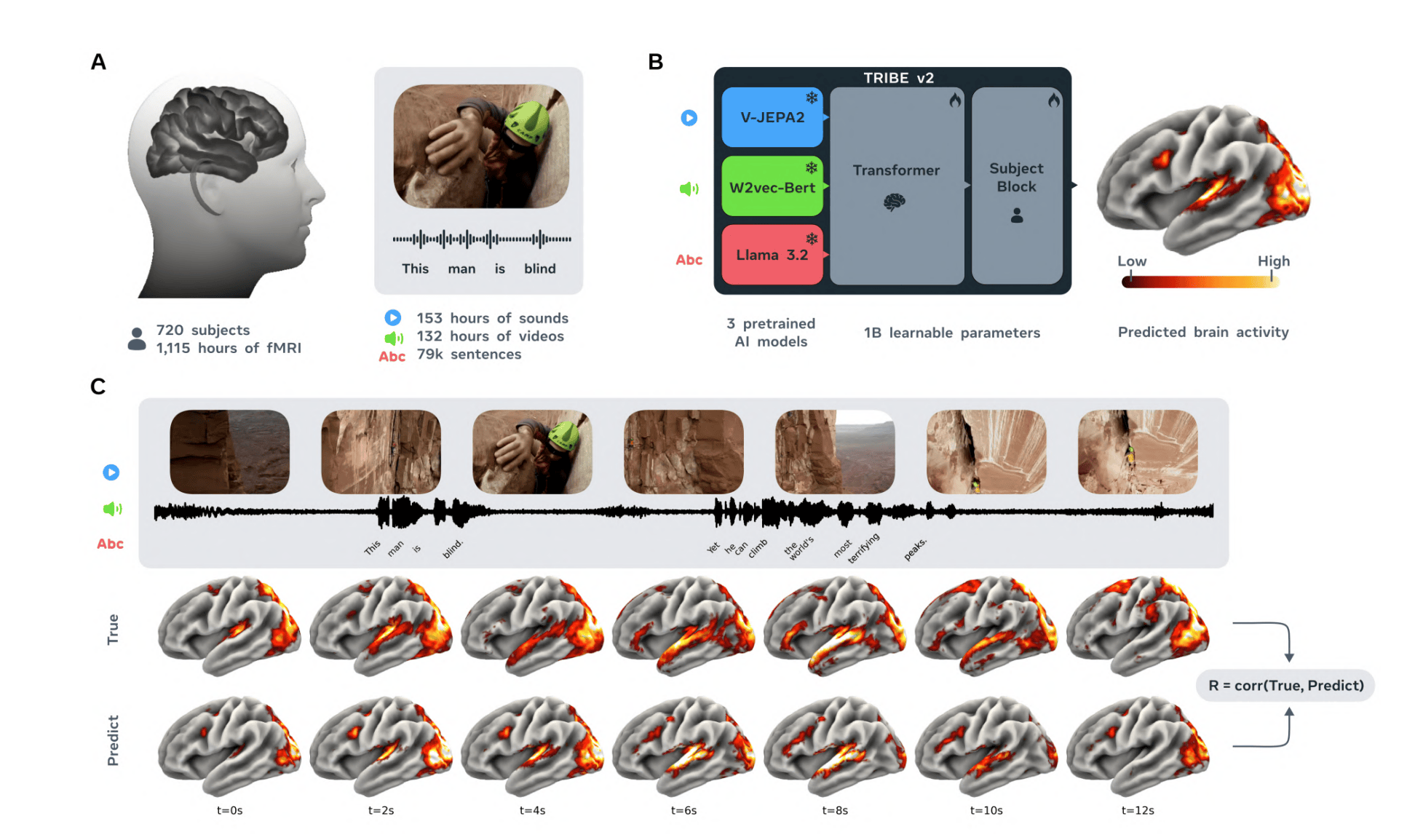 TRIBE v2 (Trimodal Brain Encoder) predicts brain responses across sight, sound, and language at the same time, with the ability to make predictions for new subjects and languages it wasn't trained on.