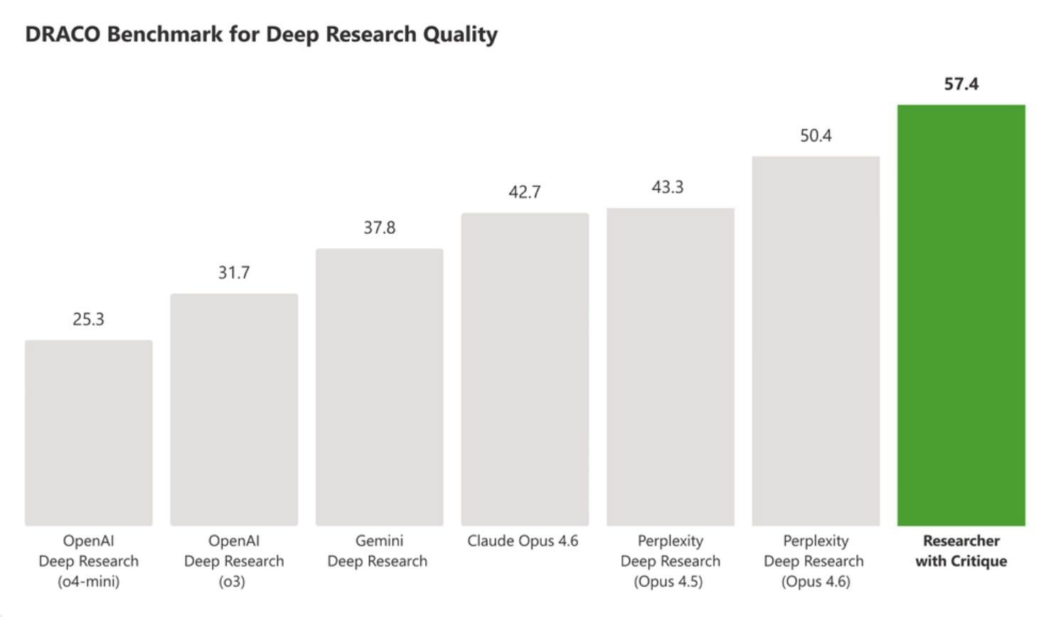 Researcher with Critique scores 57.4 on the DRACO benchmark, a 13.88% improvement over Perplexity Deep Research with Claude Opus 4.6, across 100 research tasks in 10 domains.