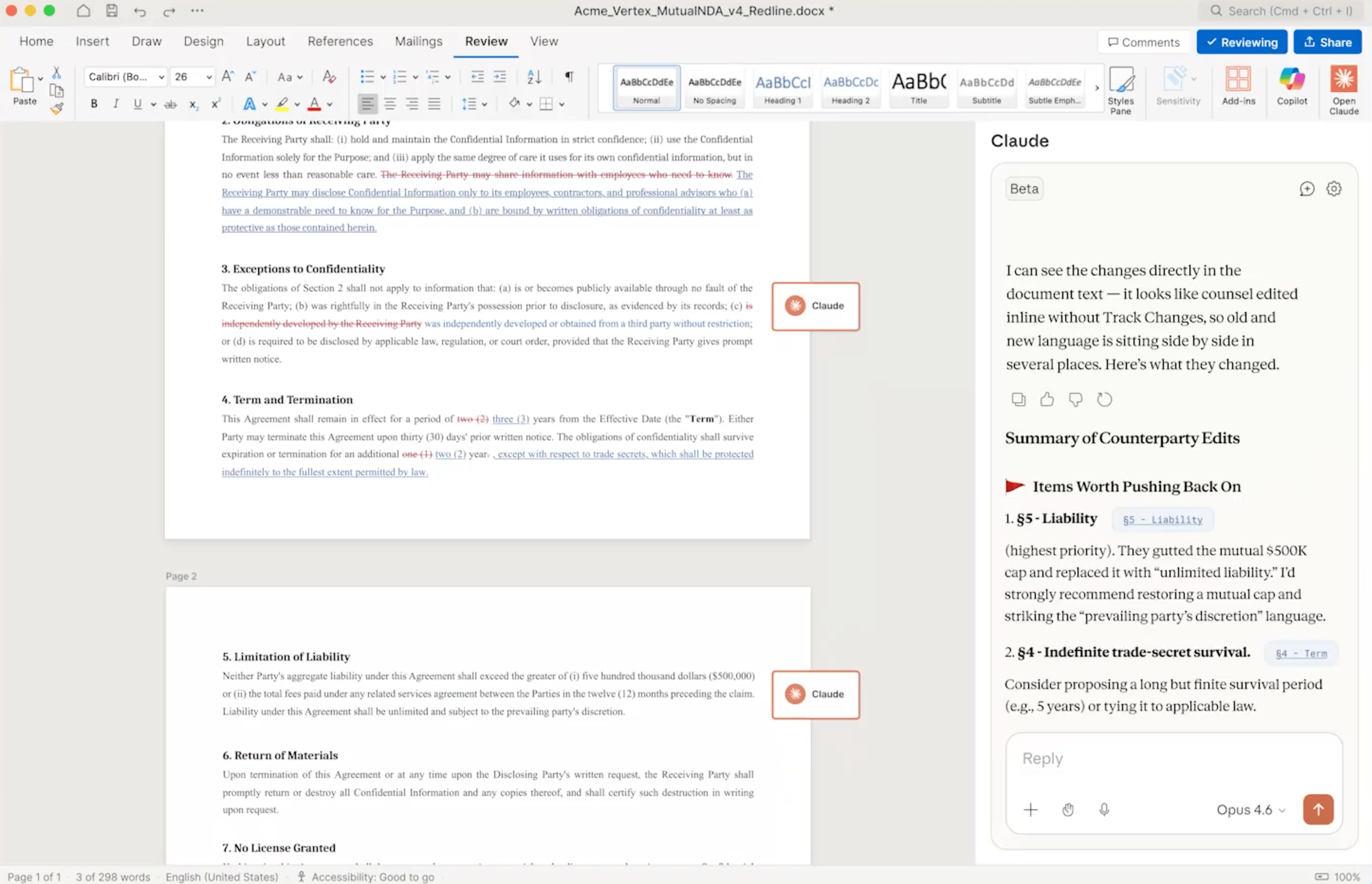 Claude's edits appear as tracked changes inside your Word document. Accept, reject, or adjust each one the same way you would handle markup from a human editor.